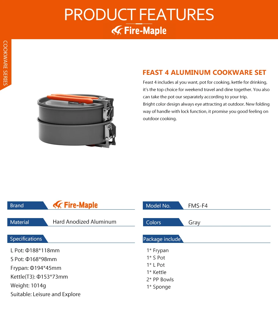 Feast 4 includes al you want, pot for cooking, kettle for drinking, it’s the top choice for weekend travel and dine together. You also can take the pot our separately according to your trip. Bright color design always eye attracting at outdoor. New folding way of handle with lock function, it promise you good feeling on outdoor cooking.